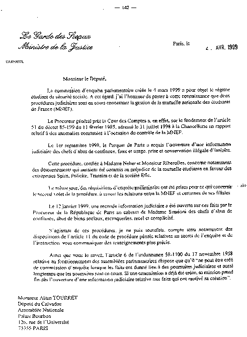 Lettre de la Garde des Sceaux en date du 2 avril 1999 au Président de la Commission d’enquête, en réponse à sa demande, sur le nombre de procédures judiciaires en cours