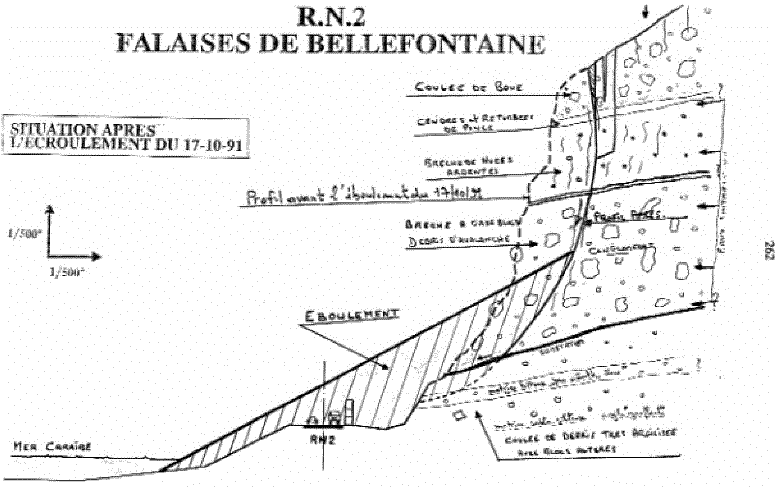 3 - basculement ("toppling") : les zones supérieures des falaises sont constituées de terrains relativement raides, qui reposent sur les couches plus "molles" du substratum. Ce dernier a tendance à fluer et tasser sous l'effet de l'érosion et de l'altération en pied de falaise. Il se produit un "défaut de portance" à la base de colonnes subverticales qui tendent alors à basculer, créant des fissures de traction, qui conduisent à des concentrations de contraintes sous l'avant des colonnes, ce qui accentue les phénomènes précédents, et peut conduire au basculement de colonnes. Ce phénomène n'a pas été constaté dans les falaises lors de nos observations, mais il demeure un risque potentiel, dont le volume peut atteindre quelques centaines à quelques milliers de m3. 4 - Glissement en masse : lorsqu'une masse de formations volcaniques de cohésion fragile repose sur un substratum incliné de faibles caractéristiques géotechniques, sa stabilité est assurée lorsque la cohésion de la tranche supérieure est intacte. Par contre, si cette cohésion disparaît (par dessiccation, fissures de retrait, altération), ou si un élément moteur (écoulement sur le substratum, poussée hydrostatique dans des fissures, séisme) vient s'ajouter à l'équilibre des efforts, une colonne de volume pouvant être important vient surcharger le substratum, conduisant à une rupture en masse, qui entraîne la colonne et une masse plus ou moins importante du substratum. Une telle rupture peut être limitée à quelques m3 (certains sont visibles en pied de falaise), mais peut atteindre des volumes beaucoup plus importants, jusqu'à quelques centaines de milliers de m3. Surveillance de la falaise : assurer la sécurité de la RN 2 Les études géologiques réalisées immédiatement après l'éboulement du 17 octobre ne révélèrent aucun autre signe de mouvement, ni dans la zone de l'éboulement, ni sur le reste de la falaise. Cependant, des indices d'instabilité (fractures ouvertes, blocs ou masses rocheuses déchaussés, petits chenaux, sous-cavages, surplombs, ...) furent identifiés en plusieurs endroits de la falaise. De même, une corniche surplombant la cicatrice de l'éboulement rocheux fut dynamitée le 6 novembre 1991. C'est pourquoi, avant que les travaux de stabilisation de la falaise ne commencent, début novembre 1991, les ingénieurs du BRGM gardèrent la falaise sous constante surveillance, dans le but de détecter l'amorce du moindre mouvement de terrain, afin de pouvoir stopper immédiatement la circulation sur la RN 2. Cette phase d'observation s'est décomposée en deux parties distinctes : - une surveillance visuelle d'une quarantaine de figures d'instabilité remarquables (blocs déchaussés, fractures, ...) pouvant entraîner des chutes de blocs ou des éboulements, a été réalisée deux fois par jour. - une surveillance instrumentale continue de plusieurs fractures ouvertes de la façade de la falaise a également été mise en place. Sept capteurs de déplacement, mesurant les mouvements à la fois à petite échelle et à grande échelle, ont été reliés à une station d'acquisition de données installée au sommet de la falaise. Aucun mouvement n'a été détecté durant cette période de surveillance continue. Les travaux de stabilisation et d'assainissement de la falaise ont conduit à faire ébouler 80 000 m3 de matériaux dans le but d'atténuer le risque d'un éboulement semblable à celui du 17 octobre. Afin de mettre à l'abri la RN 2 après reprofilage de la falaise, il a été décidé de construire une nouvelle route sur la mer, en utilisant les matériaux issus des éboulements, et d'arrêter tout glissement et éboulement futurs éventuels par la réalisation d'un merlon situé entre la falaise et la voie. Le projet a donc compris : - la création de redans de 10 mètres de profondeur et de 20 mètres de hauteur réalisés à partir de tirs de mines ; - la construction d'une nouvelle plate-forme routière décalée de 15 mètres vers la mer, comprenant une chaussée de 7 mètres de large et deux accotements de 4,50 mètres de largeur côté mer et 3,30 mètres de largeur côté merlon de protection ; - la réalisation d'un merlon de protection en terre de 4 mètres de hauteur ; - la mise en oeuvre d'enrochements lourds de protection contre les effets de houle cyclonique. L'opération globale avait été estimée à 55 MF et a été financée par la Région.