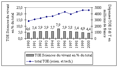 1.4. L'évolution des crédits des TGE des sciences du vivant, un indicateur peu significatif Les efforts des pouvoirs publics en faveur du programme Génomique n'étant pas inclus dans la nomenclature des TGE, l'évolution des dépenses annuelles des TGE des sciences du vivant, telle qu'elle est indiquée par le ministère de la recherche, n'a évidemment pas grand sens. Figure 1 : Evolution des dépenses annuelles des TGE des sciences du vivant