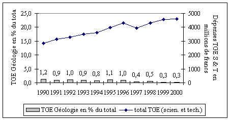Au total, les TGE de la géologie ne représentent plus que 0,3 % du total des dépenses totales des TGE scientifiques et techniques, contre 1,2 % en 1990. Figure 4 : Evolution des dépenses relatives aux TGE de la Géologie par rapport aux dépenses totales des TGE scientifiques et techniques