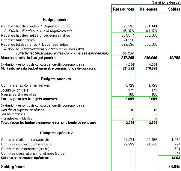 Après prise en compte de l’ensemble de ces modifications, le déficit budgétaire s’établit à 46.845 millions d’euros.
