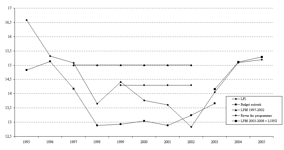 Les crédits de paiements proposés pour 2004 sont globalement en hausse de 2,0 %. Cependant, la ventilation de ces dotations laisse apparaître des écarts notables. Les dotations dévolues aux développements progressent de manière notable, compte tenu de l'avancement de certains grands programmes. Ils progressent de 7,8 % en crédits de paiements et même de 34 % en autorisations de programme. Par ailleurs, la montée en puissance de la phase de fabrication de certains programmes - et notamment le paiement des Rafale - explique la progression des dotations de fabrication, qui augmentent de 228,6 millions d'euros en 2005. Le graphique suivant présent l'évolution des crédits de paiements de développements et de fabrications depuis 2002 : ÉVOLUTION DES CRÉDITS DE PAIEMENTS DE DÉVELOPPEMENTS ET DE FABRICATIONS ![]() La croissance de ces dotations est particulièrement contraignante pour le titre V, car elles en représentent 56,3 %. En conséquence, d'autres dotations voient leur dotation stagner, voie régresser. C'est notamment le cas des crédits d'entretien programmé du matériel, dont les crédits de paiements baissent de 4,6 %. Il est vrai que les autorisations de programme progressent, elles, de 7,7 %. Cette situation s'explique aussi par le fait que les crédits pour la maintenance ont été très significativement augmentés en 2004 pour tenir compte du renchérissement du coût des prestations. L'évolution des crédits d'entretien programmé du matériel, depuis 2002, est présentée dans le graphique suivant : ÉVOLUTION DES CRÉDITS DE PAIEMENT POUR L'ENTRETIEN PROGRAMMÉ DU MATÉRIEL ![]() Les dotations pour l'achat de munitions sont en légère diminution en crédits de paiements (- 2,9 %), mais en forte baisse en autorisations de programme (- 47,7 %). Ce niveau, qui conditionne pourtant les crédits de paiements des années à venir, est plus bas que celui observé en 2002, qui à l'époque, était jugé inquiétant. L'évolution des crédits d'entretien programmé du matériel, depuis 2002, est présentée dans le graphique suivant : ÉVOLUTION DES CRÉDITS D'ENTRETIEN PROGRAMMÉ DU MATÉRIEL ![]() Globalement, les crédits de paiements destinés aux munitions, aux infrastructures, aux développements et à l'entretien programmé du matériel évoluent de la manière suivante : ÉVOLUTION DES CRÉDITS DE PAIEMENTS DESTINÉS AUX MUNITIONS, AUX INFRASTRUCTURES, AUX DÉVELOPPEMENTS ET À L'ENTRETIEN PROGRAMMÉ DU MATÉRIEL ![]() 2.- L'enveloppe de la programmation respectée Dans la version proposée par le Gouvernement, l'article 2 du projet de loi de programmation militaire fixait l'évolution des crédits de paiement consacrés à la défense sur six ans, en spécifiant qu'à « ces crédits s'ajoutent, pour la gendarmerie nationale, ceux que prévoit la loi d'orientation et de programmation pour la sécurité intérieure ». Cette mention permettait de penser que les crédits de paiement de la loi d'orientation, d'un montant de 1.033 millions d'euros (valeur de 2003), n'étaient pas compris dans les montants détaillés par le projet de loi de programmation. Pourtant, le rapport annexé précise que « la loi de programmation militaire 2003-2008 prend en compte (...) les crédits d'investissement de la gendarmerie nationale, y compris ceux attribués par la loi d'orientation et de programmation pour la sécurité intérieure ». De cette contradiction apparente, il faut comprendre que les crédits d'équipement prévus par la loi d'orientation et de programmation pour la sécurité intérieure ne sont pas compris dans les montants détaillés à l'article 2 du projet de loi de programmation militaire, mais qu'ils sont néanmoins compris dans le projet de loi. Suite à l'adoption d'un amendement de la Commission des finances, l'article 2 de la loi de programmation militaire prévoit : « Compte non tenu des crédits d'équipement de la gendarmerie nationale prévus par la loi n° 2002-1094 du 29 août 2002 d'orientation et de programmation pour la sécurité intérieure qui entrent dans le champ de la présente loi, les crédits de paiement du ministère de la Défense afférents aux dépenses en capital, inscrits en loi de finances initiale aux titres V et VI, s'élèveront, en moyenne annuelle sur la durée de la loi de programmation, à 14,64 milliards d'euros 2003. » Si l'enveloppe annuelle proposée à l'article 2 de la loi de programmation ne contient qu'une partie des crédits affectés à la gendarmerie, cette précision ne suffit pas à faire concorder le montant inscrit en loi de finances initiale pour 2003. En effet, si l'on ajoute 94 millions d'euros de crédits de paiement destinés, en 2003, à la gendarmerie pour financer les mesures spécifiques à la loi d'orientation au montant programmé, soit 13,65 milliards d'euros, on obtient un montant total de crédits d'équipement de 13.744 millions d'euros. Or, le montant inscrit au budget 2003 est de 13.644 millions d'euros. En réalité, cet écart apparent s'explique par le fait que, lors de la rédaction du projet de loi de programmation, certains membres du personnel de DCN, ainsi que des centres d'essais de la délégation générale pour l'armement, étaient rémunérés sur le compte de commerce n° 904-05 « Constructions navales de la marine militaire » dont la clôture est prévue par l'article 78 de la loi de finances rectificative pour 2001. Dès lors, ces personnels étaient rémunérés par les commandes passées par l'État, c'est-à-dire par des crédits du titre V. Compte tenu de la disparition prochaine du compte de commerce, les personnels de DCN qui ont été intégrés dans les services de la marine (pour la gestion des rechanges, notamment) sont désormais intégrés dans le périmètre budgétaire du ministère. L'une des conséquences de cette situation est le transfert des rémunérations concernées du titre V vers le titre III. Ce transfert est effectif à depuis le 1er jui