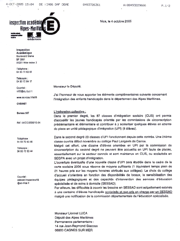 N° 2569 ______ ASSEMBLÉE NATIONALE CONSTITUTION DU 4 OCTOBRE 1958 DOUZIÈME LÉGISLATURE Enregistré à la Présidence de l'Assemblée nationale le 12 octobre 2005. AVIS PRÉSENTÉ AU NOM DE LA COMMISSION DES AFFAIRES CULTURELLES, FAMILIALES ET SOCIALES SUR LE PROJET DE loi de finances pour 2006 (n° 2540) TOME IV ENSEIGNEMENT SCOLAIRE Par M. Lionnel LUCA, Député. ___ Voir le numéro : 2568 (annexe n° 16). INTRODUCTION 5 I.- LE PROJET DE BUDGET 2006 : UN OUTIL POUR RENFORCER L'EFFICACITÉ DE LA POLITIQUE MENÉE EN MATIÈRE D'ENSEIGNEMENT SCOLAIRE 7 A. LA DÉPENSE INTÉRIEURE CONSACRÉE À L'ENSEIGNEMENT SCOLAIRE DEVRAIT PERMETTRE AU SYSTÈME FRANÇAIS D'OBTENIR DE MEILLEURS RÉSULTATS 7 1. Les moyens consacrés à l'éducation en France sont supérieurs à la moyenne des pays de l'OCDE 7 2. Les performances du système éducatif français ne correspondent pas à l'effort de la Nation 10 B. DES PRIORITÉS BUDGÉTAIRES À L'APPUI DE LA MISE EN œUVRE DES NOUVELLES DISPOSITIONS LÉGISLATIVES 12 1. Un budget axé sur la mise en œuvre des nouvelles dispositions sur l'école 13 a) Des moyens pour favoriser l'égalité des chances 13 b) L'amélioration de l'enseignement des langues vivantes 13 c) L'amélioration des remplacements de courte durée 14 d) Des emplois en rapport avec les besoins 14 e) L'insertion professionnelle des jeunes 17 2. Un budget qui intègre les mesures financières liées à la loi de décentralisation 18 C. LA NOUVELLE PRÉSENTATION DU BUDGET PERMET DE MIEUX CERNER LES GRANDS AXES DE LA POLITIQUE ÉDUCATIVE MAIS REND DIFFICILE L'EXAMEN DÉTAILLÉ DES CRÉDITS ALLOUÉS AUX ACTIONS 19 1. Cinq programmes pour décliner la mission « Enseignement scolaire » 19 a) Enseignement scolaire public du premier degré (15,8 milliards d'euros) 19 b) Enseignement scolaire public du second degré (27,8 milliards d'euros) 19 c) Vie de l'élève (5,9 milliards d'euros) 20 d) Enseignement privé du premier et du second degré (7,0 milliards d'euros) 20 e) Soutien de la politique de l'éducation nationale (2,07 milliards d'euros) 21 2. L'engagement pour l'avenir sur des objectifs et des indicateurs 21 II.- LA SCOLARISATION DES ÉLÈVES HANDICAPÉS : UNE POLITIQUE VOLONTARISTE ASSORTIE DE RÉELS MOYENS BUDGÉTAIRES 23 A. L'ACCÈS À L'ÉCOLE : UN DROIT POUR TOUS QU'IL FAUT FAIRE VIVRE 23 1. Des efforts longtemps insuffisants pour intégrer la différence à l'école 23 a) Une évolution lente et semée d'embûches depuis 1975 23 b) L'intégration scolaire en milieu ordinaire progresse trop lentement malgré des moyens importants mis en œuvre 25 c) Des progrès sont encore nécessaires dans l'effort d'accompagnement des élèves handicapés 27 2. La loi du 11 février 2005 crée une nouvelle dynamique 29 a) Des modifications substantielles pour privilégier l'intégration en milieu scolaire 29 b) Des crédits ciblés pour faciliter la mise en œuvre de la loi 31 B. LE PROJET DE LOI DE FINANCES POUR 2006 FIXE DES OBJECTIFS AMBITIEUX QUI RAPPROCHE LA FRANCE DE CERTAINS PAYS EUROPÉENS 32 1. Des objectifs ambitieux 32 2. Quelques exemples de choix européens éclairants 34 C. DES DIFFICULTÉS IMPORTANTES RESTENT À SURMONTER 35 1. Améliorer la formation des enseignants et de l'ensemble des personnels d'éducation 35 a) La formation des enseignants est la clé de la réussite 36 b) La formation adaptée des personnels d'accompagnement préoccupe tout autant 37 2. Elaborer avec chaque élève handicapé et sa famille un véritable projet éducatif et assurer la continuité des parcours scolaires 38 3. Améliorer l'accès aux bâtiments scolaires 40 TRAVAUX DE LA COMMISSION 41 I. AUDITION DU MINISTRE 41 II. EXAMEN DES CRÉDITS 79 ANNEXE 1 : COURRIER DE L'INSPECTION ACADÉMIQUE DES ALPES MARITIMES ADRESSÉ AU RAPPORTEUR 83 ANNEXE 2 : LISTE DES PERSONNES AUDITIONNÉES 85 Les crédits de la mission « enseignement scolaire » du projet de loi de finances pour 2006 s'élèvent à 58,47 milliards d'euros si l'on exclut les crédits alloués à l'enseignement technique agricole (qui devrait disposer de 1,25 milliard d'euro). A périmètre constant, l'augmentation par rapport aux crédits votés pour 2005 est de 3,65 %, dont 1,7 % au titre de la hausse des rémunérations. Ce budget prend en charge la scolarisation de 13 millions d'élèves. Le plafond d'emplois de l'enseignement scolaire (hors enseignement technique agricole pour lequel il est de 18 955 équivalents temps plein travaillé [ETPT]) s'établit à 1 104 564 ETPT. La répartition des moyens en personnel est opérée en fonction des évolutions démographiques contraires affectant le premier degré (+ 49 900 élèves en 2006 dans le public et le privé) et le second degré (- 43 700 élèves en 2006 dans le public et le privé). En conséquence, 1 000 emplois d'enseignants (333 ETPT) sont créés dans le premier degré et 1 383 emplois d'enseignants sont supprimés dans le second degré. Selon les informations communiquées par le ministère, l'application stricte des taux d'encadrement aurait dû entraîner la suppression de plus de 2 500 emplois, mais la loi d'orientation pour l'avenir de l'école du 24 avril 2005 de même que certaines dispositions contenues dans la loi du 12 février 2005 concernant les élèves handicapés, ont créé des tâches nouvelles telles que celles concernant les langues vivantes et les programmes personnalisés de réussite éducative. Un effort particulier doit donc être entrepris pour répondre à ces nouveaux engagements ce qui justifie le maintien d'effectifs élevés. Le projet de budget 2006 est aussi le premier budget présenté conformément aux dispositions de la nouvelle loi organique relative aux lois de finances du 1er août 2001. Cette profonde réorganisation budgétaire devrait permettre prochainement au Parlement, et pour certaines actions dès la prochaine loi de règlement, de mesurer les résultats obtenus dans les différents compartiments de la politique éducative et de mieux per