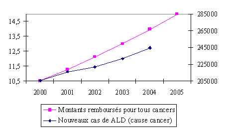 Source : direction de l'hospitalisation et de l'organisation des soins Il est difficile pour votre Rapporteur de comparer les moyens nouveaux consacrés à l'amélioration de l'offre de soins depuis 2000 dans la mesure où il ne dispose pas de données chiffrées sur les dotations de l'État entre 2000 et 2002. La comparaison entre ces deux périodes ne peut donc se faire que pour les seuls crédits de l'assurance-maladie. Enfin, il n'est pas certain que le périmètre des dotations en 2000-2002 et en 2003-2007 soit exactement le même. Cette comparaison doit être considérée avec précaution. En prenant en compte ces réserves méthodologiques, il apparaît qu'entre 100 et 120 millions d'euros ont été consacrés chaque année à l'amélioration de l'offre de soins. Certes, à partir de 2005, l'État a consacré un effort financier particulier - le budget « soins » de l'INCa s'est élevée à 11,46 millions d'euros en 2005 et de 18,42 millions d'euros en 2006 -, cependant cette dotation ne remet pas en cause le constat que depuis 2001, un effort financier constant a été consacré aux mesures « soins » de la politique de lutte contre le cancer. D'après les données fournies par l'assurance-maladie, la prise en charge des ALD a représenté un budget de 10,52 milliards d'euros en 2000 et de 14,99 milliards d'euros en 2006, ce qui représente une forte progression. Cependant, le nombre de patients admis en ALD pour cancer est passé de 205.639 cas en 2000 à 244.448 cas en 2004, soit une augmentation comprise entre 2,7 % et 5,6 % par an , ce qui constitue aussi une progression assez forte. L'augmentation des moyens consacrés aux cancers résulte donc en grande partie de la forte progression du nombre de cas, comme le montre le graphique suivant : Évolution comparée du montant remboursé par l'assurance-maladie pour le cancer et des nouveaux cas d'ald pour cancer ![]() L'évolution des nouveaux cas d'affection de longue durée pour cancer est retracée dans le tableau suivant : NOUVEAUX CAS D'AFFECTIONS DE LONGUE DURÉE POUR TUMEUR MALIGNE