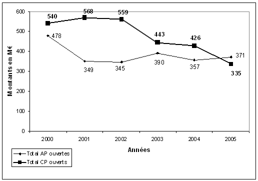 (1) Source : ministère de la culture et de la communication. * Rappel : Chap. 35-20/20 : entretien monuments État Chap. 43-30/40 : entretien monuments non État Chap. 56-20 : restauration maîtrise d'ouvrage État Chap. 66-20 : subvention d'investissement pour restauration maîtrise d'ouvrage non état (2) Le montant de crédits ouverts se calcule en agrégeant à la dotation LFI (loi de finances initiale) l'ensemble des mouvements externes et internes (reports, annulations, transferts, rattachements de fonds de concours, etc...). (3) Hors DRAC expérimentatrice mode LOLF (chapitre 59-04). (4) DRAC expérimentatrice sur l'ensemble des crédits « Patrimoine ». - Les crédits votés en loi de finances initiale ont baissé de plus de 40 % entre 2000 et 2003 et de 4,35 % entre 2000 et 2005. - l'ensemble des crédits ouverts (crédits de la loi de finances initiale + reports, annulations, transferts et rattachement de fonds de concours) a baissé de 15,51 % entre 2004 et 2005 et de 100,11 % entre 2000 et 2005... Monuments historiques : crédits ouverts depuis 2000 ![]() Source : ministère de la culture et de la communication _ Dans ce contexte, les crédits consommés ont effectivement été stables entre 2000 et 2005, tout en restant amplement insuffisants pour couvrir le financement de l'ensemble des chantiers lancés. Évolution des crédits de paiements (CP) destinés aux monuments historiques ![]() Source : ministère de la culture et de la communication Cette année, la situation a atteint son paroxysme en dépit d'un abondement supplémentaire de crédits, issus des recettes de privatisation, suite à l'engagement du ministre lors de l'examen du projet de loi de finances pour 2006, à ce que 100 millions d'euros soient affectés au patrimoine. Répartition des 100 millions d'euros des recettes de privatisation (en millions d'euros)