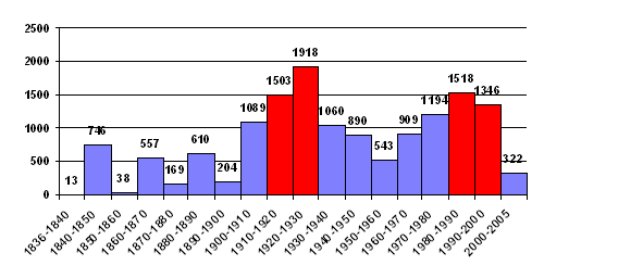 L'histogramme suivant montre que deux époques ont été très actives en matière de protection : les années 1910-1930 et 1980-2000. On observera toutefois que, depuis 1995, le rythme a considérablement ralenti par souci d'une plus grande rigueur dans la sélection. Classement des immeubles par décennie ![]() Source : ministère de la culture et de la communication Depuis deux ans, le nombre des protections est descendu à un niveau inférieur à 400 mesures par an. La sélection est donc devenue particulièrement rigoureuse puisque, par rapport à 1995, le nombre de classements et d'inscriptions a diminué de plus de moitié. Depuis 1998, le nombre des classements reste inférieur à 80 mesures par an. Le nombre des inscriptions se situe désormais à 300 mesures par an. Protection d'immeubles prises depuis 10 ans