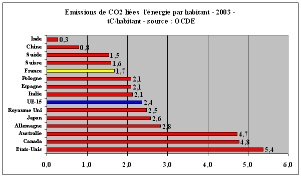 D'ores et déjà, la Chine émet pratiquement autant de CO2 que l'Union européenne à 25, avec 15% des émissions mondiales. L'Inde émet trois fois moins de CO2 que la Chine. Au sein de l'Union européenne, on doit souligner la remarquable performance de la France, qui, en 2003, a émis 2,2 fois moins de tonnes de CO2 que l'Allemagne et 1,4 fois moins que le Royaume-Uni. Rapportées au PIB, les émissions de la France sont moitié plus faibles que celles de l'Allemagne. On peut se demander si l'application du Protocole de Kyoto à l'intérieur de la « bulle » européenne tient suffisamment compte de cette disparité. L'objectif de l'Allemagne est en effet une réduction de ses émissions de gaz à effet de serre de 21% seulement, par rapport à ses niveaux de 1990. Au terme de cette évolution, les émissions allemandes resteront très supérieures à celles de la France, même si celle-ci n'a comme contrainte que de stabiliser ses émissions au niveau de 1990. · Deux secteurs d'importance majeure : la production d'électricité et de chaleur, et les transports La production d'électricité et l'ensemble de la branche énergie - production de chaleur, raffineries - ont été responsables de 40% des émissions mondiales de CO2 en 2004. Les transports sont à l'origine du quart des émissions mondiales, avec un taux de croissance élevé, en raison de l'accroissement rapide du parc automobile. L'industrie est à l'origine du cinquième des émissions mondiales de CO2 et le résidentiel tertiaire de 15 à 20% selon les estimations. Grâce à son parc électronucléaire, la performance de la France est très singulière en matière d'émissions par secteur. La branche énergie ne représente au total que 14% des émissions totales. En conséquence, les émissions des transports s'élèvent à 38% du total et le résidentiel tertiaire à 27%. En réalité, les performances du secteur des transports français ne sont pas plus mauvaises que dans les autres pays. L'excellence environnementale de la production électrique française a seulement comme conséquence paradoxale de braquer les projecteurs sur ce secteur, plus qu'ailleurs. · Réduction des émissions de CO2 et sécurité énergétique Dans la répartition mondiale des réserves en combustibles fossiles, après le Moyen-Orient qui possède plus de 60% des réserves de pétrole et plus de 40% des réserves de gaz naturel, l'Europe et les pays de l'ex URSS sont mieux dotés que les autres continents, si l'on prend en compte le charbon, le pétrole et le gaz. On voit donc que la tentation peut être grande d'arrimer l'Europe à la Russie pour assurer ses approvisionnements en pétrole et surtout en gaz naturel. Il s'agit là d'un choix politique majeur déjà fait par la Commission européenne. La récente crise du gaz naturel entre l'Ukraine et la Russie montre les dangers d'une telle orientation. Contribuant au respect par la France de son obligation de stabiliser au niveau de 1990 ses émissions de gaz à effet de serre au niveau de 1990, la réduction des émissions de CO2 a de nombreux bénéfices secondaires. Le premier est d'obliger à réduire les consommations unitaires et d'augmenter l'efficacité énergétique, ce qui peut contribuer à la baisse des coûts de production. Le deuxième est d'inciter au développement des énergies sans carbone, d'où une réduction possible de la dépendance énergétique extérieure. I.- La réduction des émissions de CO2 liées aux énergies fossiles 88% de l'énergie primaire consommée dans le monde provient des combustibles fossiles. 80% des réserves mondiales de combustibles fossiles sont constituées de charbon. Telle est la situation de l'énergie mondiale qu'on ne saurait trop rappeler. « Consommer moins d'énergies fossiles en consommant mieux » est donc une priorité.