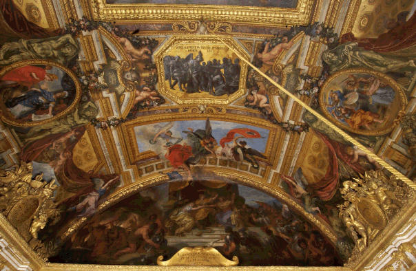 Les restaurateurs ont permis de retrouver la couleur originale des cieux, ce fameux bleu lapis lazuli, ce pigment précieux utilisé dans les peintures des enluminures, qui donne une impression de profondeur et renforce l'illusion de trompe l'œil voulue par Lebrun. Le chantier a commencé par un nettoyage impressionnant : passer l'aspirateur avec précaution sur les 1.000 mètres carrés de peintures collées au plafond depuis le XVIIème siècle, passer au pinceau chaque centimètre carré pour lever l'épaisse couche de saleté ; faire disparaître au solvant, centimètre par centimètre, les précédentes restaurations qui recouvraient...70% de la surface ! Et puis rendre aux peintures leur jeunesse sans ignorer les repentirs, cette véritable « genèse » de l'œuvre qui transparaît derrière les peintures de l'artiste lequel corrigeait, repeignait son œuvre pour atteindre à la perfection. Débuté en mars 2004, le chantier s'achèvera en mai 2007 sans que jamais la visite de la Galerie des Glaces ne soit interdite grâce à un astucieux système de « trompe l'œil » imaginé par l'équipe de Vinci.