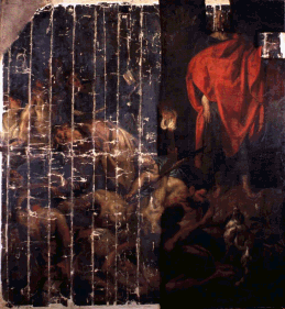 L'intendant focalise alors l'attention des scientifiques du Centre de Recherche et de Restauration des Musées de France (C2RMF). Divers échantillons microscopiques prélevés sur l'ensemble du manteau sont observés au microscope ; cette étude stratigraphique permet de déterminer nature et épaisseur des différentes couches de peinture de l'échantillon. Résultat : ces sondages confirment que la peinture verte des manches et du manteau se retrouve partout sous le rouge. Conclusion : à l'origine, l'intendant était entièrement vêtu de vert ! Question : le rouge est il un repentir ou un ajout ultérieur de Véronèse ? D'ailleurs l'aspect terne et le manque de modelé du manteau rouge distinguent ce vêtement de tous les autres. Il faut le prouver. Les historiens d'art et les restaurateurs vont à nouveau en appeler à la chimie. Le C2RMF s'attelle à la recherche de la composition de la peinture des différents personnages des « Noces ». Le travail porte plus précisément sur la détermination de l'analyse chimique du liant (huile siccative) utilisé dans la peinture du tableau. Différentes analyses montrent que tous les vêtements des personnages contenaient le même liant à l'exception du manteau rouge de l'intendant. La preuve est faite : le manteau rouge n'est pas un repeint de la main de Véronèse. D'autant que l'on relève également la présence d'un matériau de transition grisâtre entre le vert et le rouge ; un matériau de rebouchage employé avant l'exécution du repeint rouge par...un inconnu. Six experts internationaux, spécialistes de Véronèse encadraient alors l'équipe de restauration qui décida de...passer du rouge au vert et de rendre à l'intendant sa couleur d'origine. L'affaire aurait pu en rester là..... Mais la polémique s'en saisit. Pourquoi ne pas avoir tenu compte des apports des siècles ? pourquoi avoir voulu revenir à l'originel considéré, dans le cas précis comme improbable. Le « manteau » restera comme un « cas d'école » ! 2. - La Conservation : à Saint-Pétersbourg, après Catherine II, l'Assemblée Nationale sauve Voltaire