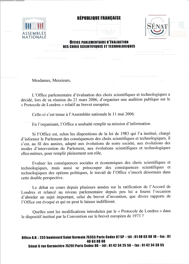Office parlementaire d'Évaluation des choix scientifiques et technologiques ________________________ COMPTE RENDU DE L'AUDITION PUBLIQUE du 11 mai 2006 sur Le protocole de Londres relatif au brevet européen