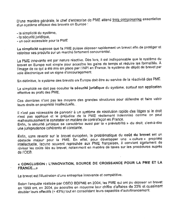 Le coût de la propriété industrielle à l'Inserm : Etant donné qu'une large protection internationale s'avère indispensable pour encourager les investissements longs et risqués d'un développement de produit à visée diagnostique ou thérapeutique, le coût d'entretien d'un portefeuille de l'Inserm reste coûteux. Le dépôt d'une demande de brevet coûte de 10 à 15 000 € et son extension internationale représente 5 à 10 000 € par pays. Il faut ensuite compter 15 à 20 000 € par pays jusqu'à la délivrance, et encore environ 250 000 € pour le maintien dans 8 à 10 pays. Aussi, en 2005, l'entretien du portefeuille de près de 600 familles de brevet a coûté environ 1,5 K€ à l'Inserm. Le coût des traductions des demandes de brevets représente un peu plus de 20% des frais de brevets. L'activité de valorisation de l'Inserm au niveau international Un récent benchmarking des activités de valorisation entre les principaux organismes internationaux de valorisation en recherche biomédicale indiquait que le ratio « revenus de licences » sur « montant du budget de recherche alloué » de l'Inserm était comparable à celui de la moyenne des universités américaines. Par ailleurs, ce benchmarking indiquait aussi que le ratio « frais de brevets » sur « revenus de licences » apparaissait être comparable à celui du MRC (Medical research Council, UK). D'une manière générale ce benchmarking révélait que la performance du dispositif de valorisation de l'Inserm en terme de retour sur licences était dans la moyenne des grandes institutions internationales. La position de l'Inserm sur le Protocole de Londres Le protocole de Londres est un accord prévoyant que seul le texte de la demande telle que délivrée par l'Office Européen, à savoir en anglais, allemand ou français, fasse juridiquement foi dans tous les pays contractants à la Convention sur le Brevet Européen. Aussi, par cet accord, l'Inserm pourrait envisager de réduire significativement ses frais de traduction. En effet, actuellement, les frais de traduction des demandes de brevets européens délivrées constitue un frein certain à une validation des droits acquis sur les territoires européens en l'absence d'un partenaire industriel. Ce même frein est constaté d'autant plus pour les jeunes sociétés de biotechnologies partenaires de l'Inserm, qui ne peuvent alors assurer une protection de leur propriété industrielle à une échelle européenne vaste. Pour être concret il faut savoir que l'Inserm estime que les frais de traduction d'une demande de brevet européen délivrée représente un peu plus de 40% des frais que l'Inserm engagent pour obtenir la délivrance d'un brevet sur les 5 principaux territoires européens (France, Allemagne, Royaume-Uni, Italie, Espagne et Irlande). Aussi, l'Inserm est donc hautement favorable à la ratification du protocole de Londres, et ceci dans un but de faire valoir ses droits de propriété industrielle en Europe à des coût plus raisonnables et parce que l'Inserm pense aussi que ce protocole une fois ratifié contribuera à encourager l'innovation biomédicale pour laquelle la majorité des acteurs sont des sociétés émergentes dont les budgets sont limités. Enfin s'agissant des considérations linguistiques, l'Inserm estime que le Protocole de Londres n'affecte en rien l'utilisation du Français comme langue officielle de l'Office Européen des brevets. En effet, même si l'Inserm dépose ses demandes de brevets principalement en Anglais, les règles de procédures écrites et orales autorisent tout à fait l'Inserm à utiliser le français dans ses relations avec l'Office Européen des Brevets. Par ailleurs, les revendications délivrées demeureront traduites en langue française, ainsi assurant la sécurité juridique des droits de propriétés industrielle en France. Annexe 5 : Note transmise par M. Denis Griesmar, ancien Vice-Président de la société française des traducteurs, délégué à la diversité culturelle du Il convient tout d'abord de noter le déséquilibre entre la représentation des partisans et des adversaires du Protocole de Londres (lequel prévoit la renonciation à la traduction en français des brevets d'invention), ainsi que la censure exercée par la suppression du débat prévu, auquel plusieurs orateurs étaient inscrits. Ce déséquilibre est constant dans toutes les manifestations organisées depuis des années sur le sujet, et ne peut être dû au hasard. On notera simplement quelques points : _ Le français étant langue officielle de l'Office Européen des Brevets (OEB) de Munich, si l'on veut le « pérenniser » véritablement, il suffit d'édicter l'obligation d'établissement des textes de brevet dans chacune des trois langues officielles, soit : anglais ET français ET allemand. _ Il semble que les négociateurs français n'aient à aucun moment envisagé cette solution, encore moins déployé d'efforts pour la défendre. _ Elle serait cependant de nature à maintenir un équilibre géopolitique indispensable. _ Au surplus, devant la nécessité de disposer d'un texte anglais pour les Etats-Unis et allemand pour l'Autriche, pays non signataire, il s'agit d'un garde-fou incontournable pour éviter l'élimination systématique du français. _ Il ne faut pas oublier qu'il n'y a pas que l'Europe, et que la langue française n'appartient pas qu'à la France. Il serait paradoxal de renoncer unilatéralement à la Francophonie et aux moyens d'influence qu'elle procure. _ Le fait que l'Angleterre et l'Allemagne aient, aux premiers temps de l'établissement de l'OEB, renoncé à la traduction systématique (pour ensuite la rétablir !), ne doit pas induire en erreur : il y a asymétrie fondamentale entre la ou les puissances dominantes, d'une part, et le ou les joueurs en second, d'autre part. Il n'est pas nécessaire d'être spécialiste de la théorie des jeux pour le comprendre. Encore faut-il vouloir défendre 