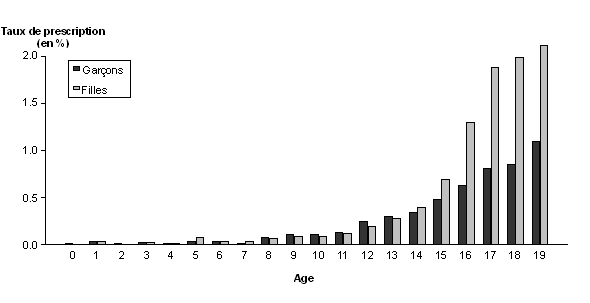 La prescription de méthylphénidate (Figure 7), dont l'indication est l'hyperactivité de l'enfant et de l'adolescent, est nettement plus importante chez les garçons que chez les filles, en accord avec le sex ratio de ce trouble. Un maximum est atteint vers l'âge de 8-12 ans (0,4 % de prescription chez les garçons). Figure 8. Prescriptions d'antidépresseurs (ISRS) en 2004