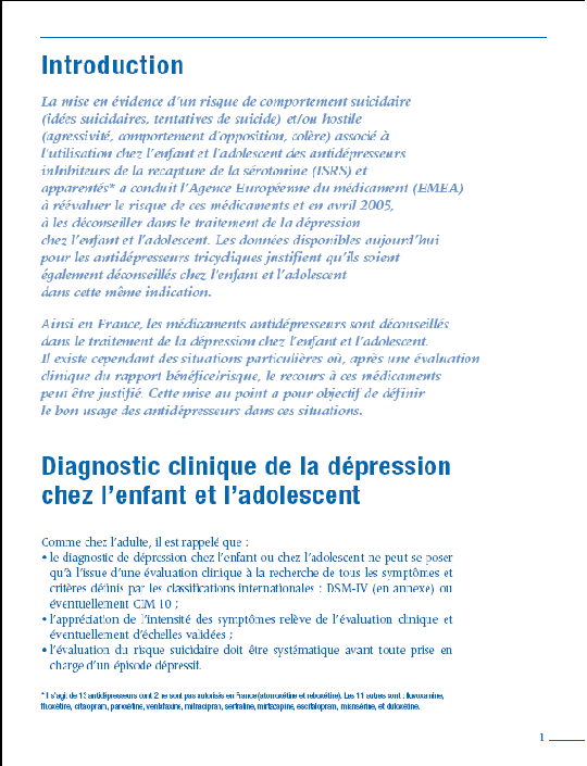 ANNEXE 5 : ANAES. PRISE EN CHARGE D'UN ÉPISODE DÉPRESSIF DE L'ADULTE EN AMBULATOIRE (EXTRAITS) III.2.1. Les antidépresseurs Toutes les classes thérapeutiques ont montré leur efficacité dans l'épisode dépressif. Il n'a pas été démontré de différence d'activité statistiquement significative entre les imipraminiques et les ISRS et ISRSNA chez les patients traités en ambulatoire. Le risque d'abandon de traitement toutes causes confondues ou à cause d'un effet indésirable est plus faible sous ISRS et ISRSNA que sous imipraminiques, de manière statistiquement significative (la réduction du taux d'abandons sous ISRS et ISRSNA est d'environ 4 %). Les ISRS et ISRSNA sont donc considérés comme mieux tolérés, notamment à long terme. Le choix d'un antidépresseur repose préférentiellement sur quelques critères spécifiques : - l'utilisation thérapeutique d'effets latéraux (par exemple, recherche de sédation, d'anxiolyse, ou de stimulation) (grade C) ; - l'indication préférentielle d'une classe thérapeutique dans certaines comorbidités psychiatriques, par exemple les ISRS pour les troubles obsessionnels (grade C) ; - le respect des contre-indications (comorbidités organiques) et des risques d'interactions médicamenteuses selon les résumés des caractéristiques des produits inscrits dans le Vidal. En l'absence d'indications particulières, il est recommandé de choisir l'antidépresseur le mieux toléré, le moins dangereux en cas d'absorption massive, et le plus simple à prescrire à dose efficace (grade C). Les ISRS, ISRSNA, et autres antidépresseurs non imipraminiques non IMAO obéissent le mieux à ces exigences. (...) III.3. Stratégies thérapeutiques en ambulatoire III. 3.1. En première intention Dans l'épisode dépressif léger à modéré, les antidépresseurs et les psychothérapies sont efficaces (grade A pour les antidépresseurs, grade B pour les psychothérapies cognitivo-comportementales, grade C pour les autres psychothérapies, accord professionnel pour la psychanalyse). L'association antidépresseurs-psychothérapie n'a pas fait la preuve d'une plus grande efficacité que la psychothérapie seule dans ces formes légères à modérées (grade C). - En cas d'épisode dépressif léger, une psychothérapie est proposée en première intention, en fonction de l'accessibilité de ce type de traitement et des préférences du patient (accord professionnel) ; sinon, les antidépresseurs peuvent être proposés. - En cas d'épisode dépressif modéré, les antidépresseurs sont proposés en première intention (accord professionnel) ; l'association antidépresseurs-psychothérapie peut être proposée en cas de difficultés psycho-sociales ayant un retentissement marqué sur la vie du patient (accord professionnel). Dans l'épisode dépressif sévère, les antidépresseurs sont indispensables (grade A). L'association antidépresseurs-psychothérapie peut être proposée (grade C). Les antidépresseurs peuvent être associés aux neuroleptiques dans les formes psychotiques (accord professionnel). Les différents antidépresseurs couramment utilisés en médecine générale doivent être utilisés aux doses efficaces spécifiées pour chaque molécule. La relation entre efficacité clinique et concentration plasmatique est probable pour les imipraminiques et la venlafaxine, les données les plus solides concernant l'imipramine. Ce n'est pas démontré pour les ISRS, bien que certaines études aient montré l'intérêt d'augmenter les doses chez des patients qui présentent un épisode dépressif sévère. (...) III. 3.3. Arrêt du traitement médicamenteux L'arrêt du traitement médicamenteux d'un épisode dépressif isolé peut être discuté 6 mois à 1 an après obtention de la rémission clinique (grade A). La réduction de posologie doit se faire très progressivement, sur plusieurs mois. Toute réapparition des symptômes nécessite une reprise du traitement à pleine dose, selon les schémas indiqués précédemment. Le risque maximum de rechute se situant dans les 6 à 8 mois qui suivent l'arrêt du traitement, le patient doit être revu régulièrement durant cette période (accord professionnel). ANNEXE 6 : AFSSAPS. MISE AU POINT. LE BON USAGE DES ANTIDÉPRESSEURS AU COURS DE LA DÉPRESSION CHEZ L'ENFANT ET L'ADOLESCENT