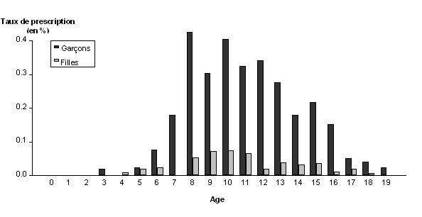 1. Taux de prévalence exprimé en nombre d'enfants avec une prescription de stimulants pour 1000 enfants de la population Cette étude illustre le fait que la fréquence d'utilisation des psychotropes est importante chez les enfants aux Pays-Bas, avec 7 enfants sur 1 000 âgés de 0 à 19 ans usagers de psychostimulants ou d'anxiolytiques/hypnotiques. L'augmentation de l'usage de psychostimulants est notable, ainsi que la précocité de ces traitements, avec une proportion non négligeable d'enfants traités dès la tranche d'âge de 0-4 ans. Une étude plus récente confirme cette croissance importante des prescriptions de psychostimulants chez les enfants des Pays-Bas35. Des études conduites au Royaume-Uni en 199936, et en Allemagne en 200037, trouvent des fréquences d'usage comparables, avec respectivement 0,5 % des enfants de 5 à 14 ans et 0,6 % des enfants de 5 à 15 ans traités par ce médicament. Peu d'informations sont disponibles sur le nombre d'enfants traités par méthylphénidate en France, où la prescription de ces produits n'est autorisée qu'à partir de l6 ans. Trenque et collaborateurs38 estiment que le nombre d'usagers de ce produit était d'environ 4 500 en 2001 (1800 en 1997), et qu'approximativement 0,047 % des enfants de 6 à 18 ans étaient traités par ce médicament (0,019 % en 1997). La fréquence d'usage serait donc nettement moindre qu'aux Pays-Bas. A titre comparatif, Trenque et collaborateurs rapportent qu'aux USA, 2,8 % des enfants âgés de 5 à 18 ans étaient traités pour hyperactivité par ce médicament en 1995, et que cette fréquence d'usage va croissant, particulièrement chez les enfants d'âge pré-scolaire. Une étude conduite en Irlande entre janvier 2001 et août 2004 a plus spécifiquement exploré l'usage des antidépresseurs chez les enfants de moins de 15 ans39. Les données sont issues des bases des General Medical Services qui offrent des soins gratuits à environ 30 % de la population irlandaise, dont 28 % des enfants. La population explorée dans cette étude est donc caractérisée par une surprésentation des personnes en situation sociale précaire. Les prescriptions étaient codées selon la classification ATC. En 2003, les antidépresseurs ont été prescrits à 1 079 enfants soit 0,43 % de la population éligible (par rapport à 16,9 % dans la population adulte, dont 9 % dans la tranche d'âge 16-24). Les filles ont été traitées 1,6 fois plus souvent par antidépresseurs que les garçons. Les types d'antidépresseurs prescrits étaient similaires chez les enfants et les adultes, les ISRS étant le groupe le plus prescrit. Plus de la moitié (58 %) des enfants avaient une seule prescription d'antidépresseur, et seuls 19,4 % d'entre eux avaient des prescriptions de 3 mois ou plus (comparativement, 23,5 % des adultes avaient une seule prescription et 66,5 % avaient des prescriptions de 3 mois ou plus). L'évolution globale des prescriptions au cours du temps montre une baisse significative entre janvier 2001 et août 2004, qui n'est toutefois mise en évidence que pour les antidépresseurs tricycliques, et non pour les ISRS (pendant la même période, la fréquence d'usage augmente chez les adultes). La prévalence d'usage des antidépresseurs chez les enfants dans cette étude (1 sur 2000) est comparable à celle de l'étude conduite aux Pays-Bas. Dans les autres pays européens, la fréquence d'usage des antidépresseurs est estimée à 0,6 % au Royaume-Uni en 2004 chez les moins de 18 ans40 et 0,4 % en Allemagne en 2003 chez les moins de 20 ans41. Là encore, on ne dispose pas d'études similaires en France. Quel que soit le pays, il est vraisemblable que ces estimations doivent être actuellement revues à la baisse suite aux restrictions d'usage des antidépresseurs dans ces tranches d'âge (cf. question 3). Nous rapportons pour mémoire une étude conduite sur un échantillon très spécifique constitué de médecins généralistes libéraux42. Une enquête transversale téléphonique a été réalisée en mars 2002 auprès d'un panel de généralistes exerçant dans la région PACA (Provence Alpes Côte d'Azur). Ce panel excluait les médecins avec une pratique exclusive de l'homéopathie ou de l'acupuncture, et était constitué par la méthode des quotas après stratification de l'échantillon par sexe, âge et taille de leur zone de pratique. Parmi les médecins éligibles, 600 (55,8 %) ont accepté de participer. Le questionnaire explorant les pratiques incluait une question sur l'usage de psychotropes par le médecin (« pendant les 12 derniers mois, avez-vous consommé un hypnotique ou un anxiolytique ? »), ainsi que sur le nombre de prescriptions d'anxiolytiques ou d'antidépresseurs faites au cours des quatre dernières semaines. Les prévalences d'usage ont été comparées à celle de la population générale de PACA, à partir de données collectées sur un échantillon de 8 609 personnes d'âge similaire (30-68 ans). Près d'un généraliste sur 4 (23 %) a rapporté avoir fait usage au moins une fois d'hypnotiques ou d'anxiolytiques dans l'année précédente, les femmes étant plus nombreuses (28,5 %) que les hommes (21 %) à rapporter un tel usage. Cette prévalence d'usage est plus élevée que dans l'échantillon de sujets de la population générale (17,5 %). Plus d'un médecin sur 10 (12 %) rapportait un usage régulier (plus d'une fois par mois). Les caractéristiques professionnelles associées de manière indépendante à l'usage de ces psychotropes étaient le fait d'avoir une insatisfaction par rapport à la pratique, une clientèle comportant beaucoup de pathologies lourdes, le fait d'exercer en secteur 1, d'avoir un nombre élevé d'heures de travail hebdomadaires (55h). L'usage d'hypnotiques ou d'anxiolytiques par le médecin était associé avec un plus grand nombre de prescriptions d'anxiolytiques, mais pas d'antidépresseurs. En analyse stratifiée sur l'âge, ces associations ne sont 