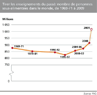 Douze mois plus tard, les émeutes de la faim ont quitté l’actualité médiatique. La situation est-elle pour autant moins dramatique ? Elle n’a au contraire jamais été aussi tragique : cette année, pour la première fois depuis 1970 (1), plus d’un milliard de personnes souffrent de la faim. Plus précisément, selon le PAM et la FAO, la population globale en état de malnutrition a littéralement explosé en un an, comme en témoigne le graphique reproduit ci-après qui montre que les pires craintes exprimées l’an dernier se sont finalement révélées fondées : la malnutrition touche désormais 1,02 milliard d’habitants de la planète. Plus de la moitié, – 642 millions – vivent en Asie, et un quart, – 265 millions de personnes –, en Afrique, dans laquelle le tiers de la population totale est sous-alimentée, alors même que cette région a été moins touchée que d’autres par la crise économique. La faim progresse partout dans le monde, y compris dans certains pays développés, et ce sont bien sûr les plus pauvres, dont le nombre s’est également brutalement accru, qui en souffrent. Des régions jusqu’alors relativement épargnées par ce fléau, telles l’Amérique latine et la Caraïbe, connaissent également une forte augmentation du nombre des personnes qui en sont victimes (2).