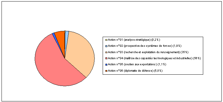 L’action 4 (maîtrise des capacités technologiques et industrielles) occupe toujours le premier rang avec 56 % des crédits, suivie par l’action 3 (recherche et exploitation du renseignement intéressant la sécurité de la France), avec 35 % du budget, et l’action 6 (diplomatie de défense) (5,8 %). Viennent ensuite l’action 2 (prospective des systèmes de forces) (1,9 %), l’action 5 (soutien aux exportations (1,1 %) et l’action 1 (analyse stratégique) (0,2 %).