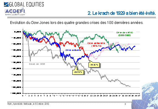 Par ailleurs, l’évolution de l’indice Dow Jones – lequel reflète la croissance mondiale – au cours des quatre dernières grandes crises, soit celles du krach de 1929, de la crise pétrolière, de la crise dite des NTIC ou de la « bulle Internet » et, enfin, de la crise actuelle, montre que le 9 mars 2009 nous nous situions exactement dans la configuration de 1929 sans toutefois que des erreurs comparables aient été commises : je songe, en particulier, à l’abandon des banques à la faillite, au refus de baisser les taux d’intérêt et à l’absence de plan de relance. Nous avons donc toutes les raisons de penser que nous nous apprêtons à renouer avec les fondamentaux économiques.