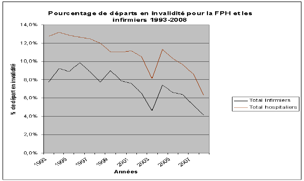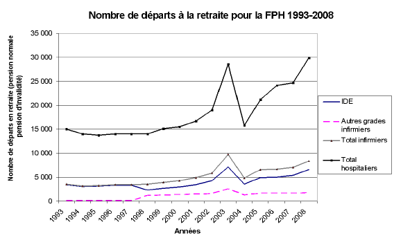 Les effectifs de la filière connaissent un fort renouvellement : sur le plan démographique, la fonction publique hospitalière se caractérise par un taux important de départs à la retraite. Entre 2005 et 2008, environ 75 600 agents ont fait valoir leurs droits en retraite dont 75 % appartiennent à la filière soignante et de rééducation. Cette tendance va se poursuivre dans les années à venir. Un infirmier sur deux sera ainsi parti en retraite d’ici 2015. Pour les aides soignants, on estime à 5000 par an les départs à la retraite dans les dix prochaines années.