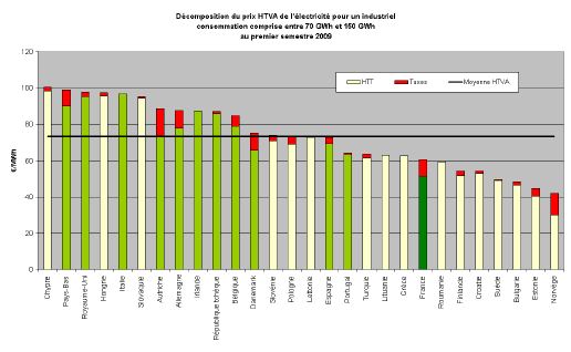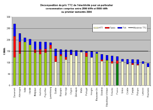 Au sein de l'Union européenne, la France affiche des prix de l'électricité pour le consommateur final parmi les plus bas des 27 pays (cf. graphes). Cette situation reflète la compétitivité du mix électrique français composé à 78% de nucléaire et environ 14% d'hydraulique. Les tarifs réglementés, calés sur le coût de production moyen du parc français, permettent aux consommateurs de bénéficier de cet atout. La très grande majorité des pays européens présentent quant à eux des parcs de production constitués essentiellement de centrales thermiques plus coûteuses.