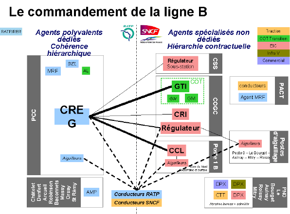 Par ailleurs, les deux opérateurs en charge du RER, la RATP et la SNCF, sont des entreprises nationales dotées de missions de service public. C’est également le cas de Réseau ferré de France (RFF) qui a la responsabilité de gérer les circulations sur une grande partie des voies empruntées par le RER et dispose même dorénavant de la propriété de l’infrastructure ferroviaire, c’est-à-dire – hors des parties relevant de la RATP sur les lignes A et B – de la quasi-totalité des équipements techniques constitutifs du réseau.