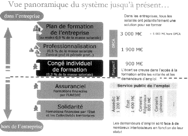 Ce rapport analysait les financements mobilisés en faveur de la formation professionnelle et avançait le chiffre de 34 milliards d’euros pour 2006, au titre de la formation initiale (hors enseignement professionnel supérieur) et de la formation continue, soit l’équivalent de 2 % du PIB. Excluant les dépenses relatives aux lycées professionnels, le jaune budgétaire annexé au projet de loi de finances pour 2009 évaluait à 27,1 milliards d’euros les sommes consacrées à la seule formation continue et à l’apprentissage.