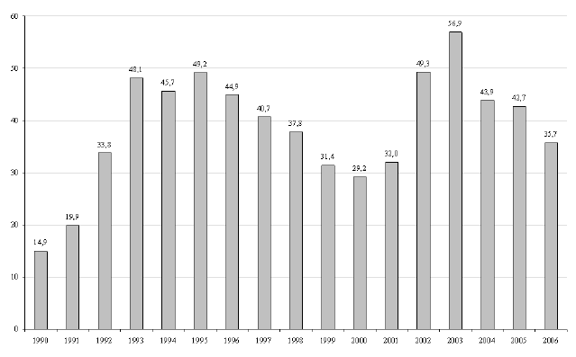 35 () En valeur absolue, la dette publique a augmenté de 5,4 milliards d’euros, soit un montant très inférieur à la progression enregistrée en 2005 (+ 68,5 milliards d’euros).