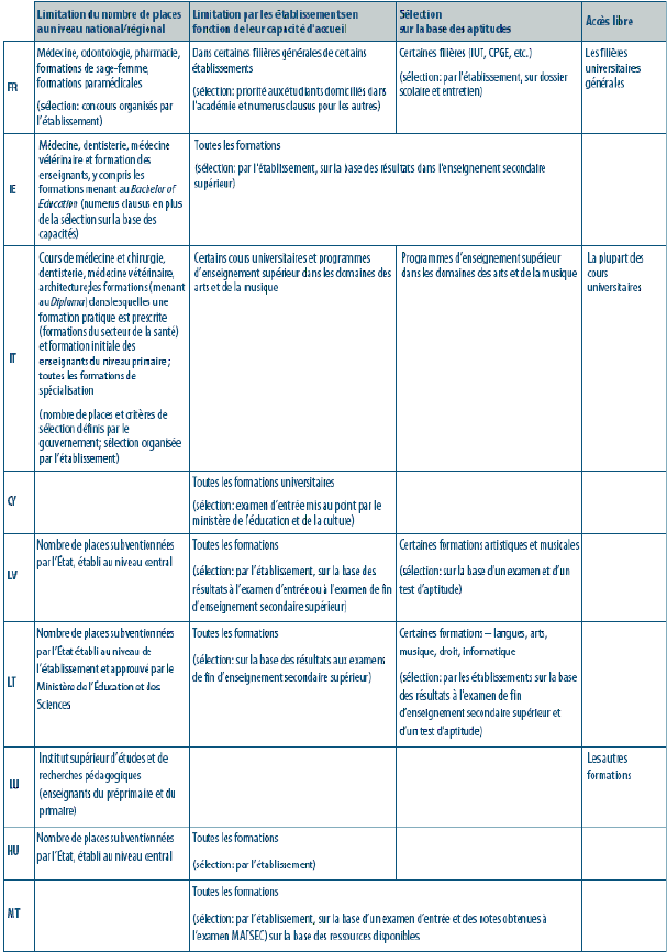 Les universités et écoles supérieures déterminent elles-mêmes leurs effectifs et leurs conditions d’admission. Le financement est limité à un nombre prévu d’étudiants, mais les établissements sont libres d’en accepter davantage que l’effectif financé à condition qu’ils puissent garantir la qualité des prestations éducatives dispensées. L’enseignement est gratuit, les étudiants n’ayant pas à verser de droits de scolarité.