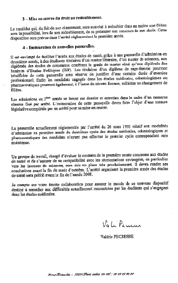 Dans la lignée de ces travaux, le rapport précité de M. Jean-François Bach propose des mesures concrètes de réforme de la première année des études de médecine et de pharmacie. Le 1er août 2008, la ministre de l’enseignement supérieur et de la recherche a adressé aux présidents d’universités, aux recteurs d’académies et aux directeurs d’unités de formation et de recherche (UFR) de médecine, d’odontologie et de pharmacie une circulaire par laquelle elle leur présente les conclusions de ce rapport et précise les suites qu’elle entend leur donner, certaines pouvant être appliquées dès l’année universitaire 2009-2010 par voie réglementaire, ce qui suppose que les universités s’y préparent dès à présent.