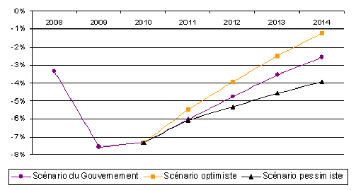 5 () Calculs du Rapporteur général à partir des chiffres définitifs 2009 et des hypothèses de croissance en volume du PIB, d’élasticité des recettes et d’évolution des dépenses publiques figurant dans le rapport annexé au projet de loi de programmation des finances publiques pour 2011-2014.