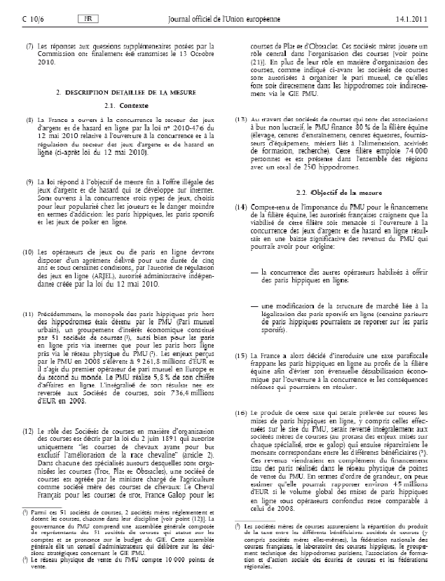 Par une lettre du 17 novembre 2010 publiée au JOUE le 14 janvier 2011 (cf. annexe no 3), la Commission européenne a décidé d’ouvrir une procédure contre la France, estimant que, d’une part, cette taxe constituerait une aide d’Etat non compatible avec les règles des traités européens relatives à la mise en œuvre de la politique européenne de la concurrence et que, d’autre part, les autorités françaises auraient commis une erreur manifeste d’appréciation en qualifiant les missions de service public confiées aux sociétés de courses de services d’intérêt économique général (SIEG). A la suite du déclenchement de la procédure par la Commission, le Parlement français, dans le cadre de l’article 34 de la loi de finances pour 2011(5), a transformé à titre provisoire la redevance en taxe directement versée à l’Etat. Parallèlement le taux du prélèvement sur les paris hippiques en ligne et sur le réseau physique a été abaissé.