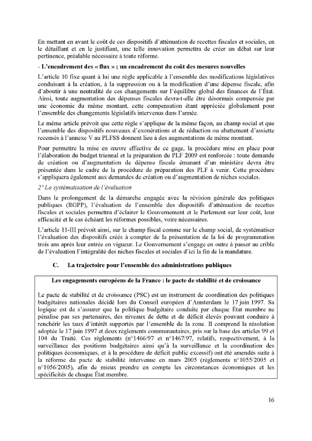 La programmation des finances publiques s’inscrit dans le cadre des engagements européens de la France. Elle traduit les incidences du plan de relance de l’économie, telles que retracées dans la loi n° 2008-1425 du 27 décembre 2008 de finances pour 2009 et la loi n° du de finances rectificative pour 2009. Elle s’établit comme suit, sous réserve que les hypothèses économiques du rapport annexé à la présente loi soient confirmées :