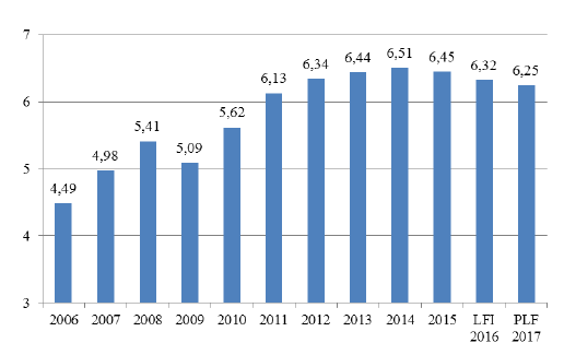 ● Les crédits inscrits dans le projet de loi de finances pour 2017 confirment la tendance constatée les années précédentes au ralentissement de l’augmentation des dépenses du CAS Pensions, puisqu’il est prévu qu’elles augmentent de 0,79 % par rapport aux crédits inscrits en loi de finances pour 2016. Elles s’élèveraient au total à 57,65 milliards d’euros, contre 57,2 milliards d’euros en 2016.
