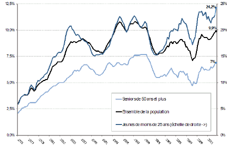 Parallèlement, le taux de chômage, à savoir la part des actifs sans activité et à la recherche d’un emploi, approche des 10% en France métropolitaine (9,9% au 3ème trimestre 2012, cf. figure 9). Celui des 15-24 ans avec 24,2% ne connaît pas de précédent.