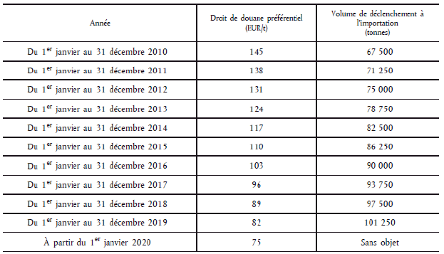 - Pour la banane, il est prévu un règlement de sauvegarde spécifique - ou « mécanisme de stabilisation » -, déclenchant une suspension du traitement préférentiel dans le cas d'une forte augmentation des importations en provenance des deux pays andins au-delà d'un certain seuil (seuil qui sera relevé chaque année). Ce mécanisme cessera de s'appliquer lorsque le droit de douane préférentiel aura atteint 75 euros par tonne en 2020.