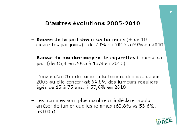 80 () En France, plus de la moitié (57,6 %) des fumeurs réguliers âgés de 15 à 75 ans déclarent avoir envie d’arrêter, selon les résultats du Baromètre santé 2010 de l’Inpes.