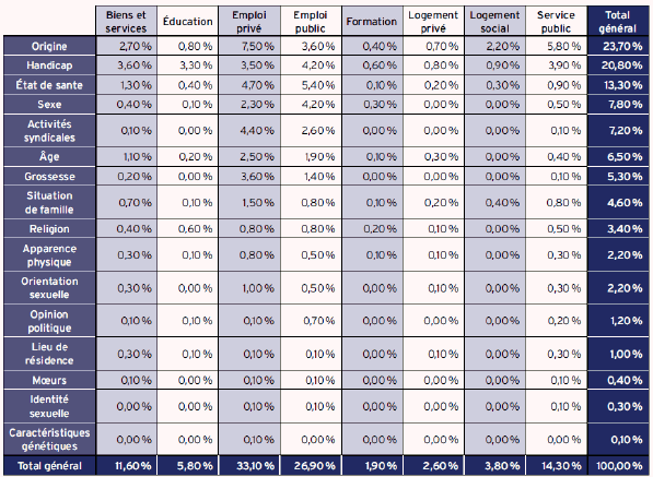 En 2014, selon les données du tableau ci-après (14), le premier motif de saisine du Défenseur des droits dans la lutte contre les discriminations reste celui de l’origine, à hauteur de près d’un quart de l’ensemble des réclamations. L’origine représente 65 % des saisines en matière de service public et reste le premier critère invoqué en matière d’accès aux biens essentiels, tels que le logement privé, les comptes bancaires et en matière d’emploi privé où il atteint 22 %. Les discriminations fondées sur le handicap et sur l’état de santé viennent ensuite, suivies des discriminations sexistes. Le monde du travail, qui concentre plus de la moitié des saisines, constitue le lieu privilégié d’expression de ces pratiques.