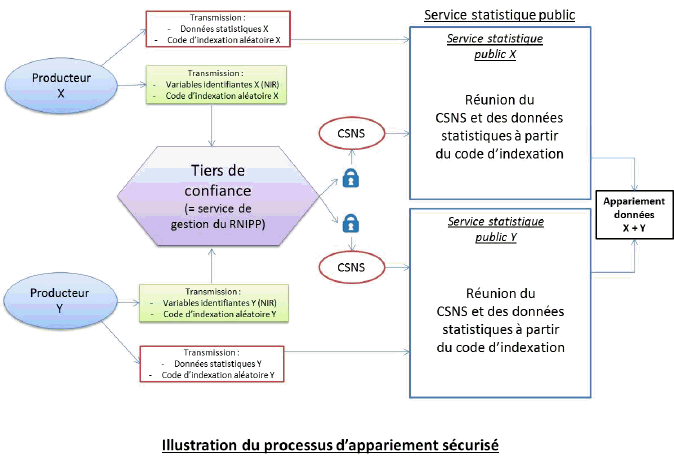 Un tiers de confiance au sein de l’INSEE sera seul habilité à détenir la clé de chiffrement permettant de passer du NIR au code statistique non-signifiant, c’est-à-dire le nouveau numéro permettant de faire les appariements. Selon l’INSEE, la fréquence de renouvellement de cette clé de chiffrement devra être fixée entre cinq et dix ans afin de concilier protection des identités et souplesse des procédures, tout en ayant le temps de faire des études dans des délais utiles.