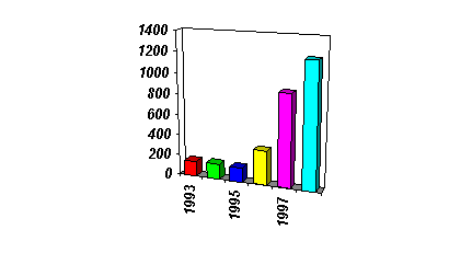 Source : Office national des forêts. Le commerce du bois guyanais ne représente quune infime partie du commerce mondial. Selon les exploitants, seulement 40 % de la production peuvent être exportés en raison de la qualité des bois. Laugmentation de la production, au-delà dun certain seuil, ferait rapidement apparaître un stock dinvendus sur le marché local, ce qui obérerait la rentabilité des entreprises. La création dun centre technique du bois, financé par la région, le FEOGA et le CIRAD entre pleinement dans les projets des collectivités territoriales et constituera un pôle dexcellence en matière de connaissance des bois, de leurs caractéristiques et de leurs qualités afin de les valoriser au mieux. 5. Lor Durant vingt ans, de 1975 à 1995, un inventaire des richesses du sous-sol guyanais a été réalisé. Il a confirmé que, parmi les minerais recensés, lor était le seul à avoir une dimension industrielle. Lexploration aurifère et la création dune exploitation industrielle exigent une technicité et des capitaux que ne possèdent pas les entreprises locales, ni les entreprises nationales. Cest pourquoi lexploration menée actuellement en Guyane est principalement le fait de filiales françaises créées à cet effet par des compagnies internationales spécialisées. Une dizaine de sociétés internationales parmi les 23 premières mondiales sont maintenant en opération en Guyane. Durant lannée 1998, 82 millions de francs ont été investis dans la recherche de gisements par les opérateurs privés, contre 169 millions de francs en 1997 (la baisse étant essentiellement due à la faiblesse du cours de lor). Les retombées locales de ces dépenses correspondent pour partie à des salaires versés aux salariés employés en Guyane, à lutilisation dentreprises locales pour transporter du matériel ou effectuer des travaux de déboisement, de terrassement... Lor est devenu le premier poste à lexportation de la Guyane devant le secteur de la pêche. La demande mondiale, en 1998, sélevait à 3 925 tonnes et la Guyane, avec environ 2,44 tonnes produites (), se situait aux environs du 50ème rang mondial. La part de lor dans le total des exportations (hors activité spatiale) continue de progresser : 23,3 % en 1996, 36,3 % en 1997 et 37 % en 1998. PRODUCTION (kilos bruts)