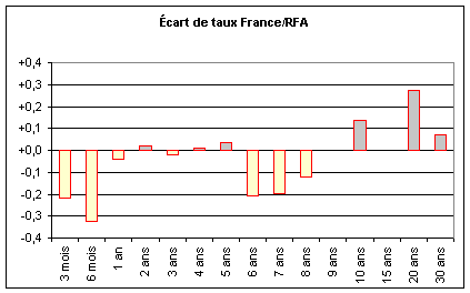 Les deux parties extrêmes de la courbe sont relativement aisées à commenter. Sur la partie gauche (échéances courtes), les titres français sont plus performants du fait de leur marché plus large et plus efficace. Sur la partie droite (échéances longues, essentiellement le trente ans), les taux allemands sont alternativement supérieurs ou inférieurs aux taux français selon les dates auxquelles on trace la courbe des taux. La partie médiane de la courbe (de un an à dix ans) attire plus lattention. Le graphique ci-après retrace, en fonction de la maturité des emprunts, lécart de taux entre la France et lAllemagne pour chaque échéance.