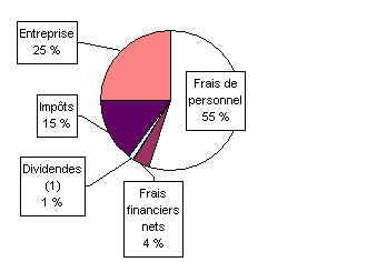 La recherche de gains de productivité par externalisation, recours à la sous-traitance et concentration sur le savoir-faire de l'entreprise a permis de renforcer l'autofinancement de l'entreprise. Ainsi, la part de la valeur ajoutée qui reste dans l'entreprise a augmenté de six points entre 1992 et 1997. Les bons résultats ont entraîné une importante hausse du prélèvement fiscal, alors que les actionnaires (Hewlett Packard Corp en l'occurrence) n'ont pas vu leur part croître de façon substantielle. Il est enfin à noter que la part attribuée à l'entreprise n'est que très partiellement utilisée dans l'investissement. L'attribution de ressources en faveur de ce dernier est en régression continue (14,4 % de la valeur ajoutée en 1992, contre 5,7 % de la valeur ajoutée en 1997). Hewlett Packard France consacre la trésorerie, générée par l'exercice, au désendettement et au renforcement de ses liquidités (cf. 3.10). Répartition de la valeur ajoutée