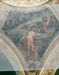 PLAFOND DE LA BIBLIOTHÈQUE Numa et Égérie Au fond d'un bois mystérieux et couché sur le gazon, le roi de Rome s'entretient avec la nymphe. Cette dernière est assise au milieu des roseaux, et ses pieds baignent dans sa source limpide. Une biche étonnée s'arrête un instant à les considérer.