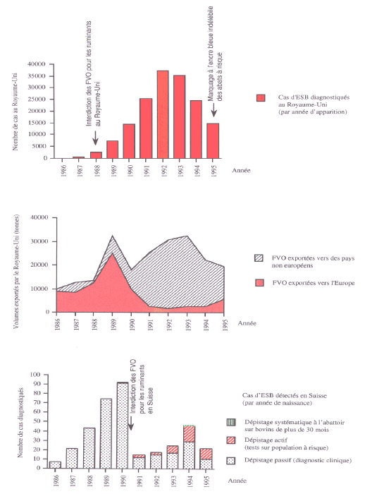 Cette démonstration est étayée par les schémas suivants, qui font apparaître : - l'impact de l'interdiction partielle des FVO en Europe occidentale, avec l'exemple particulièrement significatif de la Suisse ; - la représentation des cas d'ESB chez des bovins nés après l'interdiction des farines au Royaume-Uni. Représentation des cas d'ESB correspondant à des bovins ![]() Le Royaume-Uni pouvait légalement exporter des bovins nés après juillet 1988 et en incubation d'ESB (42 558 cas NAIF sont apparus entre juillet 1988 et décembre 2000 soit près de 23 % des cas d'ESB diagnostiqués au Royaume-Uni). Impact de l'interdiction des FVO en Europe continentale (exemple Suisse) ![]() Ces graphiques font apparaître : - l'augmentation des exportations de farines animales britanniques à compter de leur interdiction au Royaume-Uni ; - l'augmentation corrélative des cas d'ESB nés au cours des années d'importation ; - une reprise des cas d'ESB nés dans les années qui ont suivi l'interdiction des FVO, en raison d'un probable recyclage d'animaux contaminés dans des farines destinées à des non ruminants. Ici comme ailleurs, des contaminations croisées ont donc pu se produire. Correspondance entre l'apparition de cas d'ESB au Royaume-Uni ![]() On constate ainsi que la contamination du cheptel français s'est effectuée dans des conditions qui n'étaient pas contraires à la réglementation de l'époque : - par les bovins vivants importés du Royaume-Uni alors qu'ils étaient infectés (importations stoppées seulement en 1996) ; - par les farines britanniques massivement importées en 1989 (29 000 tonnes au 1er semestre 1989 contre 10 000 au second semestre 1988), l'avis aux importateurs n'étant intervenu que le 13 août 1989 ; - par les farines françaises fabriquées avec les bovins britanniques importés et les bovins français contaminés par les farines britanniques. Certes, les farines sont interdites pour l'alimentation des bovins dès le 24 juillet 1990, mais : · le champ de l'interdiction est très étroit et laisse une grande marge de man_uvre à l'utilisation légale des farines (pour les ruminants autres que les bovins et tous les autres animaux) ; · les circuits de fabrication des aliments pour animaux ne sont pas systématiquement séparés en fonction des catégories d'utilisateurs (bovins - autres animaux), ni les moyens de transport des aliments, ni sans doute les récipients utilisés dans les exploitations. Toutes les conditions sont remplies pour que les contaminations croisées produisent leur plein effet, d'autant plus que ce n'est qu'en 1994 qu'intervient l'interdiction d'utiliser les farines animales pour l'ensemble des ruminants dans tous les pays communautaires. La mesure essentielle de lutte contre l'ESB intervient en 1996 en France avec : - l'interdiction d'incorporer des cadavres d'animaux, les saisies sanitaires et les MRS dans les farines destinées à l'alimentation des animaux (et dont l'utilisation est légale pour les non-ruminants) ; - l'interdiction d'utiliser les MRS pour la consommation humaine. En effet, il a été prouvé que ce sont ces organes et ces animaux qui sont contaminants. À cette époque, seul le Royaume-Uni prend une mesure de précaution comparable - et plus radicale encore - en interdisant toute utilisation des farines animales. Mais les autres Etats membres de l'Union européenne ne prennent aucune mesure de cet ordre et refusent d'adopter les textes que leur propose la Commission européenne à plusieurs reprises (cf. supra Deuxième partie). Dès lors, c'est en toute légalité que circulent sur le territoire communautaire - et pénètrent en France - des produits contaminés. Il est donc secondaire pour la commission d'enquête de s'interroger sur la part résiduelle qu'ont pu jouer des importations frauduleuses ; cette question est toutefois essentielle pour la justice, laquelle est saisie de plaintes contre de telles fraudes, ce qui conduit la commission d'enquête à respecter la séparation des pouvoirs. Il va de soi que l'intensité des contaminations croisées a pu être accrue par des phénomènes de fraude, tandis qu'elle a été, à l'inverse, réduite par le comportement de certains organismes professionnels, si l'on en croit leur témoignage. Par ailleurs, la Fédération nationale des groupements de défense sanitaire du bétail (FNGDS), ayant effectué une mission en Grande-Bretagne en 1989, alerte le ministère de l'Agriculture à son retour, sur l'épizootie d'ESB, sans toutefois évoquer les farines animales. Pour d'autres acteurs, comme les fabricants d'aliments, la rétrospective est nuancée de regrets : « En France, il aurait fallu aller plus vite. Depuis 1996, nous nous sommes concentrés sur ce problème. Début 1997, nous avons estimé avoir manqué quelque chose d'important en France. Les fabricants d'aliments auraient dû dès 1996 et 1997 recommander à leurs adhérents de ne plus utiliser de farines animales. C'est ce que nous aurions dû faire et nous n'avons pas eu le courage de faire. Nous nous rendions compte du fait que l'on allait rencontrer des problèmes. En 1997, on nous disait qu'il y avait extrêmement peu de risques que les farines animales qui se trouvaient par inadvertance dans les aliments pour ruminants puissent contaminer un bovin. Les scientifiques à l'époque disaient qu'il en faudrait une telle quantité qu'il y avait peu de chance pour que cela contamine l'animal. Trois ans plus tard, on s'aperçoit que quelques grammes suffisent. C'est toute l'inquiétude que l'on peut avoir sur cette maladie. Il ne s'agit pas d'accuser, mais, encore une fois, il est beaucoup plus facile après coup de voir ce qui s'est passé, et en tenant compte de toutes les connaissances que l'on a accumulées depuis. De toute évidence, depuis 1996, nous étions face à un problème de santé humaine. Le principe de précaution dont on parle tant aujourd'hui, peut-être aurait-il fallu l'appliquer