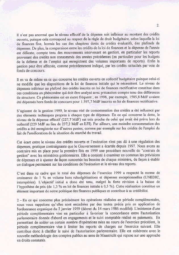 N° 2244 ASSEMBLÉE NATIONALE CONSTITUTION DU 4 OCTOBRE 1958 ONZIÈME LÉGISLATURE Enregistré à la Présidence de l'Assemblée nationale le 14 mars 2000 RAPPORT D'INFORMATION DÉPOSÉ en application de l'article 145 du Règlement PAR LA COMMISSION DES FINANCES, DE L'ÉCONOMIE GÉNÉRALE ET DU PLAN (1) ET PRÉSENTÉ PAR M. Didier MIGAUD, Rapporteur général, -- ANNEXES (1) La composition de cette commission figure au verso de la présente page. Lois de finances. SOMMAIRE ____ Pour en faciliter la consultation ce rapport est présenté en deux fichiers. Cliquer ici pour consulter le texte du rapport. ANNEXE 1 : LETTRE EN DATE DU 16 FÉVRIER 2000 DU MINISTRE DE L'ÉCONOMIE, DES FINANCES ET DE L'INDUSTRIE ET DE LA SECRÉTAIRE D'ETAT AU BUDGET SUR L'EXÉCUTION BUDGÉTAIRE DE 1999 71 ANNEXE 2 : RÉPONSE DE L'AGENCE COMPTABLE CENTRALE DU TRÉSOR SUR LE FONCTIONNEMENT DES COMPTES DE PRÊTS AUX ÉTATS ÉTRANGERS 75 ANNEXE 3 : MISE EN JEU EN 1999 DE LA GARANTIE DE L'ETAT AU PROFIT DE LA CAISSE CENTRALE DE RÉASSURANCE 81 AUDITIONS DE M. CHRISTIAN SAUTTER, MINISTRE DE L'ÉCONOMIE, DES FINANCES ET DE L'INDUSTRIE, ET DE MME FLORENCE PARLY, SECRÉTAIRE D'ETAT AU BUDGET : - le mercredi 9 février 2000 sur l'exécution budgétaire de 1999 85 - le mardi 14 mars 2000 sur les résultats budgétaires de 1999 et les perspectives budgétaires pour 2000 97