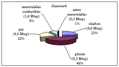 La lecture de ce bilan permet de conclure que la politique conduite par l'Allemagne dans le domaine de l'éolien vise moins la production d'électricité que la constitution d'une industrie compétitive à finalité exportatrice. 1.2.4. Les réticences de l'Allemagne vis-à-vis de la directive SER et des certificats verts L'objectif de la directive SER selon lequel l'Allemagne devrait tirer 22 % de son électricité des énergies renouvelables paraît quelque peu irréaliste à différents responsables de la politique énergétique allemande. La part des renouvelables étant actuellement de 5 % hors déchets, l'objectif d'un doublement leur paraît plus réaliste. Par ailleurs, le système des certificats verts à l'échelle européenne ne paraît pas rencontrer l'adhésion ni du Gouvernement fédéral ni du SPD. La principale raison invoquée est que l'Allemagne doit mobiliser tous les sites, même les sites peu favorables, pour atteindre ses objectifs. Le mécanisme des certificats verts tendrait au contraire à privilégier les sites européens les mieux ventés. En tout état de cause, le Gouvernement estime indispensable que quiconque veuille installer une éolienne puisse le faire dans la mesure où l'électricité est un bien précieux et où le seul doublement de la part des renouvelables constitue un défi très ambitieux. Une hausse conséquente du prix de l'électricité est considérée comme un moyen de financement acceptable, à condition toutefois qu'elle ne devienne pas intolérable. En définitive, l'Allemagne pourrait être considérée, à première vue, comme donnant l'exemple d'un traitement idéologique des questions énergétiques. L'arrêt de centrales nucléaires au bout d'une exploitation de 32 ans, alors qu'elles auraient pu fonctionner plus de 40 ans en produisant un kWh à très bas prix en raison de leur amortissement, peut sembler une aberration économique. En réalité, travaillée par les idées écologiques depuis des décennies et faisant preuve d'une sensibilité et d'une ouverture séculaires vis-à-vis de la nature, la société allemande a décidé, en prenant toutefois des précautions sous la forme d'une transition progressive, de tourner le dos à l'électronucléaire qu'elle considère dans son ensemble comme une source d'énergie d'un intérêt transitoire, pour recourir à un cocktail énergétique diversifié comprenant un volume notable mais non décisif d'énergies renouvelables. Compte tenu de la force de son appareil industriel et des débouchés intérieurs et extérieurs de ces nouvelles sources d'énergie, ce qui aurait pu risquer de constituer un naufrage économique, pourrait au contraire se révéler comme un virage stratégique opéré avec prescience et donc comme un pari gagnant. 2. L'éolien, un atout du Danemark, complété par un joker : le gaz Le Danemark offre l'exemple d'une politique énergétique résolue avec trois coups de barre majeurs depuis la crise pétrolière de 1973. Après avoir choisi le développement durable en 1999, le Danemark a désormais pour objectif que les énergies renouvelables assurent le tiers de son approvisionnement en énergie en 2030. L'industrie danoise, appuyée par la recherche publique et forte de ses positions de leader mondial pour l'éolien, est en situation de répondre à cette attente. 2.1. Les énergies renouvelables ou le choix politique du Danemark Le Danemark accorde une place fondamentale à l'objectif d'une indépendance énergétique aussi grande que possible. Depuis 1973, les pouvoirs publics ont en conséquence renforcé successivement la place du charbon, puis celle du gaz et aujourd'hui celle des énergies renouvelables. Cette nouvelle orientation repose sur un choix plus global, celui du développement durable, et sur des atouts industriels soigneusement cultivés, ce qui augure bien du succès de cette stratégie. 2.1.1. Les coups de barre successifs de la stratégie énergétique danoise Après le choc pétrolier de 1973, le Danemark décide de réduire sa dépendance énergétique vis-à-vis du Moyen Orient en développant sa production d'électricité à partir du charbon importé d'Australie et du Canada. Alors que celle-ci était à peu près nulle à cette date, la part du charbon dans la consommation d'énergie primaire atteindra plus du tiers en 1991. Mais en 1996, le Danemark, dans le cadre de son choix en faveur du développement durable, élabore une nouvelle planification énergétique. L'objectif est d'éliminer le charbon. Mais un fait nouveau et fondamental s'est produit. A la fin des années 1980, le Danemark s'est lancé dans la prospection pétrolière et gazière en Mer du Nord. Les recherches s'avèrent couronnées de succès. Ainsi, en 2000, le Danemark produit 17,8 millions de tonnes de pétrole. Sa production de gaz naturel a atteint 8,2 milliards de m3, la même année. Cette production non seulement suffit à ses besoins3, mais lui permet d'exporter 3,2 milliards de m3. Le charbon continue toutefois en 1999 de jouer un rôle important dans l'approvisionnement en énergie primaire (voir graphique ci-après). Tableau 43 : Approvisionnement du Danemark en énergies primaires en 1999 (source : AIE-OCDE) ![]() Le rôle du charbon dans la production d'électricité est également prédominant (voir graphique ci-après). Tableau 44 : Répartition par filières de la production d'électricité du Danemark (38,9 TWh) en 1999 (source : AIE-OCDE) ![]() Parallèlement au développement de sa production d'hydrocarbures, le Danemark se fixe un objectif très ambitieux : développer la contribution des énergies renouvelables à hauteur de celle du gaz ou du pétrole. Deux plans énergétiques majeurs orchestrent ces évolutions, le plan de 1990 et celui de 1996, intitulé « Énergie 21 », par référence au siècle à venir et à l'Agenda 21 de Rio. Le Danemark démontre ainsi l'exemple du fait qu'une politique énergétique volontariste est encore possible 
