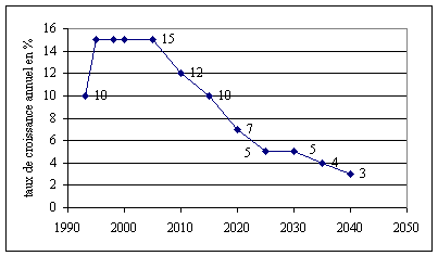 Il est à noter que les économies d'échelle générées par l'augmentation de puissance sont en fait pratiquement limitées aux coûts de génie civil. Certains constructeurs d'éoliennes doutent qu'il soit possible de faire passer le coût de production du kWh éolien en dessous de 25 cF / kWh. Il est certain toutefois que la prise en compte des coûts externes de production des filières classiques comme les centrales thermiques à charbon serait de nature à améliorer la position relative de l'éolien. A cet égard, la fixation de la valeur de la tonne de carbone à 35 dollars semble être un niveau raisonnable, en l'absence d'un marché. Cette hypothèse conduit à conférer à la production éolienne un crédit carbone de 3,2 à 4,9 cF / kWh. En tout état de cause, les coûts de production dont on peut disposer à l'heure actuelle en France n'intègrent pas les coûts de raccordement. Or les fermes éoliennes sont la plupart du temps situées en bord de mer ou sur des reliefs, c'est-à-dire dans des zones où le réseau électrique est soit inexistant soit de faible puissance. La réalisation de fermes éoliennes devra donc s'accompagner d'extensions du réseau. 1.4. Les espoirs placés dans les fermes éoliennes offshore L'offshore représente, pour beaucoup d'industriels de l'éolien, un véritable eldorado. De fait, grâce à des régimes de vents plus favorables et plus réguliers, la puissance efficace d'une éolienne offshore est plus importante que la même machine située à terre. La résistance de ces machines aux tempêtes ne semble pas problématique aux yeux des constructeurs qui mettent en avant l'expérience acquise dans l'ingénierie des plates-formes pétrolières. En revanche, si la durée de vie d'une éolienne à terre est estimée à 15 ans, il est difficile, faute d'une expérience suffisante, de déterminer si les problèmes de corrosion et les difficultés de maintenance n'abrégeront pas cette durée de vie. En tout état de cause, pour rentabiliser les coûts de raccordement au réseau par des lignes sous-marines ainsi que pour faciliter la maintenance, il sera nécessaire de construire des plates-formes offshore de grande puissance, allant sans doute jusqu'à 100 MW. Il s'agit donc là de projets pour lesquels on ne dispose à l'heure actuelle que d'une expérience réduite. En France, TotalFinaElf étudie un projet de lancement d'une plate-forme d'éoliennes de 40 à 90 MW au total au large de Port-la-Nouvelle dans le Languedoc. D'autres projets sont en cours d'étude pour une ferme offshore de 70 MW au large du Cotentin, une autre de 40-55 MW dans le Finistère et enfin une autre de 100 MW en Belgique. Une compagnie pétrolière comme TotalFinaElf qui a la maîtrise des travaux offshore dans le cadre de l'exploitation de ses gisements de pétrole et de gaz, est sans doute l'entreprise la mieux placée pour conduire de tels projets. 1.5. Des marchés étrangers en forte expansion La croissance du marché mondial des éoliennes est très rapide. Les capacités installées ont augmenté de 22 % en 2000 et atteignaient 16 600 MW à la fin 2000. D'ici à 2004, l'Allemagne devrait doubler sa capacité installée, l'Espagne la multiplier par quatre (voir tableau ci-après). Tableau 5 : Prévisions de capacités éoliennes installées (source : Alstom)