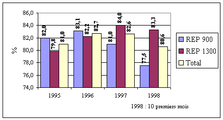 Un autre paramètre clé de la compétitivité du parc est la disponibilité des réacteurs. Sur les quatre dernières années, on constate que la disponibilité du palier REP 1300 augmente, grâce à lélimination des défauts de démarrage de ce palier à laugmentation du temps de séjour en réacteur du combustible. En revanche, la disponibilité du palier REP 900 a plutôt tendance à stagner. En 1997 lindisponibilité de 17,4 % se décomposait en 12,3 % liés aux arrêts programmés pour renouvellement du combustible et travaux de maintenance effectués dans le cadre normal de lexploitation et 5,1 % liés aux problèmes survenus sur les matériels ou aux retards dans les arrêts programmés6. Figure : Taux de disponibilité des réacteurs nucléaires dEDF