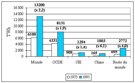 La progression des rejets de CO2 par les pays dEurope de lEst est soutenue. La Russie doit être mise à part. La crise persistante dans ce pays a en effet ralenti son activité économique et diminué les émissions de CO2. La progression des émissions de lInde et de la Chine est en revanche massive. Les Etats-Unis de 1990 à 1996, une préfiguration des évolutions spontanées possibles en Europe Le cas des Etats-Unis mérite dêtre analysé en détail, compte tenu de limportance de leurs émissions de CO2 dans le total mondial et en raison de leur valeur de contre-exemple. La consommation d'énergie a augmenté aux Etats-Unis en moyenne de 1,7 % par an depuis 1990. La consommation d'électricité sest également élevée de 2,0 % par an depuis la même date, soit un rythme conforme à la tendance de longue période dans les pays industrialisés. La majeure partie des émissions de gaz à effet de serre (82 %) correspond au CO2. Elle est donc imputable aux combustibles fossiles. Dans la période récente, ce sont les transports et la production d'électricité qui sont aux Etats-Unis principalement responsables des augmentations des rejets de CO2. Au cours de la période considérée, plusieurs centrales nucléaires ont été arrêtées. Par ailleurs, le prix du gaz a augmenté sur la période. En conséquence la part du charbon s'est accrue dans la production délectricité, avec, comme résultat, laugmentation des émissions de 9 % sur la période 1990-1996. La combinaison dune croissance lente mais réelle de la consommation délectricité et dune baisse de la part du nucléaire dans la production de celle-ci, a produit mécaniquement une augmentation importante des émissions de CO2. A contrario, le nucléaire dans l'Union européenne permet d'éviter lémission de 700 millions de tonnes de gaz carbonique par an. Ce total correspond à l'ensemble des émissions de CO2 du parc automobile de l'Union européenne17. Autrement dit, « pour obtenir la même économie de CO2, il faudrait supprimer toutes les voitures particulières de l'Union européenne ». La croissance mondiale de la consommation dénergie La consommation mondiale d'énergie devrait croître à lavenir à un rythme moyen de 2 à 3 %. Dans de nombreux pays, en Europe de lEst, en Chine, en Amérique du Nord, la consommation spécifique d'énergie en pourcentage du PIB est le double ou le triple de celle de l'Europe ou du Japon. Pour restreindre les émissions de CO2, une première solution existe, celle de diminuer lintensité énergétique grâce à une augmentation des rendements énergétiques et aux économies dénergie. Mais laugmentation de la consommation délectricité accompagne toujours le développement économique. Sans compter la part des émissions dues aux transports, il est certain que la production délectricité, par son augmentation, va contribuer à la croissance des rejets de CO2, dans des proportions qui dépendent évidemment de la composition du parc électrique futur des pays considérés. La croissance de la consommation délectricité La croissance de la consommation délectricité accompagne toujours le développement économique. Le graphique suivant illustre ce phénomène. Il représente lévolution entre 1973 et 1995 de la production délectricité dans différents ensembles de pays et en Chine. Figure : Croissance de la production annuelle délectricité entre 1973 et 199518