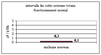 Figure : Coûts externes en cF/kWh hors effet de serre de la production délectricité en France, selon ExternE 1998.