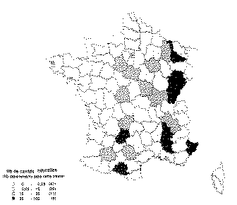 2.2.2. Communes ayant déclaré avoir des désordres La carte présente le nombre de communes par département ayant déclaré un ou plusieurs désordres. D'une manière générale, les désordres sont probablement sous-estimés. Ceci tient à l'origine des données, fréquemment administrative (plutôt que communale) et basée sur un positionnement géographique plutôt que sur l'inventaire ou la description des désordres.