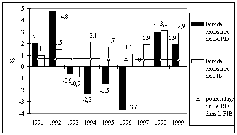 Au demeurant, le budget civil de recherche et développement exprimé en pourcentage du PIB est passé de 0,70 % en 1993 à 0,61 % en 1999. Cette évolution recouvre une croissance des crédits qui est effectivement intervenue en valeur absolue mais qui a été moins rapide que celle du PIB (voir figure suivante). Sur toute la période 1994-1999, la croissance du BCRD est plus lente que celle du PIB. Le différentiel de taux de croissance atteint 2,5 points en moyenne sur la période. Figure 27 : Evolution des taux de croissance annuels en volume du BCRD et du PIB et du ratio BCRD/PIB en %14